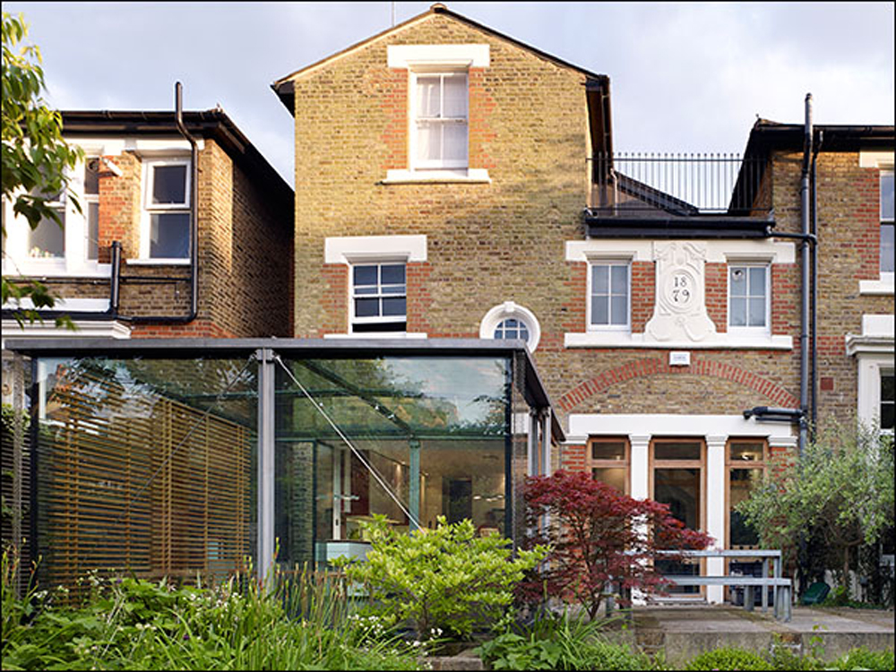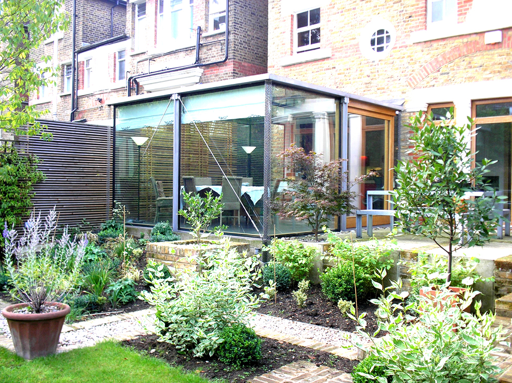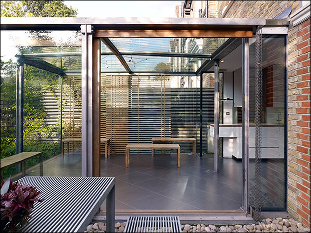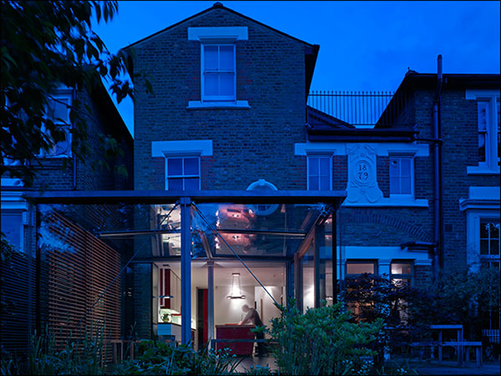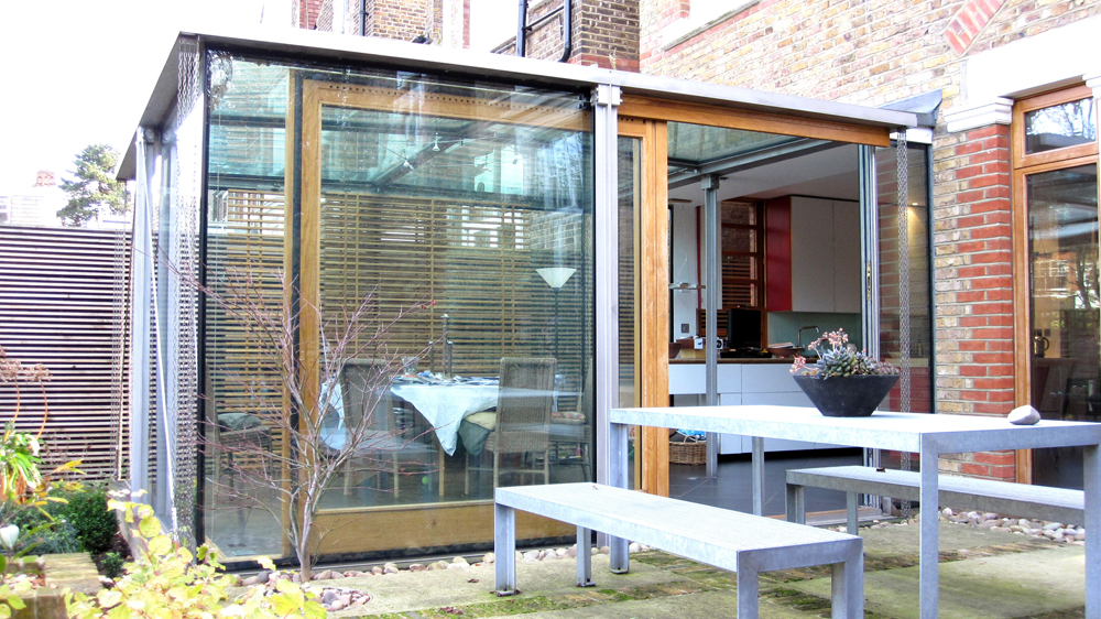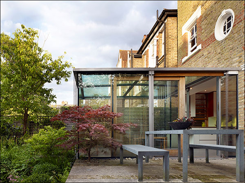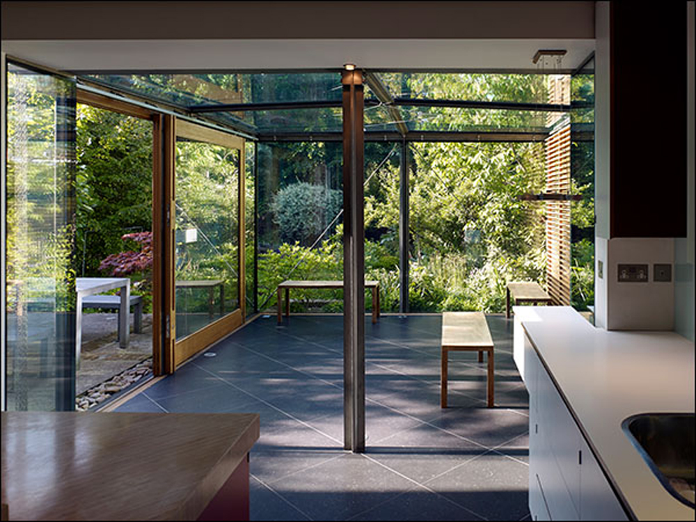 A glass and stainless steel extension to a detached house, whereby the support is formed from stainless steel miesian columns supporting the centre of each perimeter edge allowing the corners each to be cantilevered. So thisfrees the corners for a glass only junction.