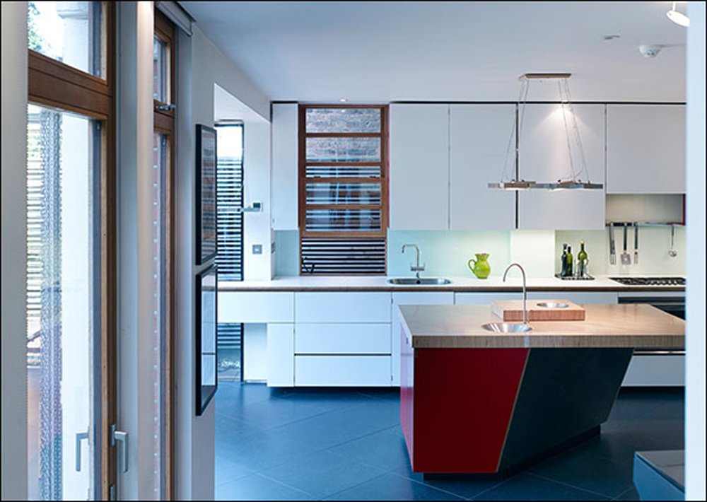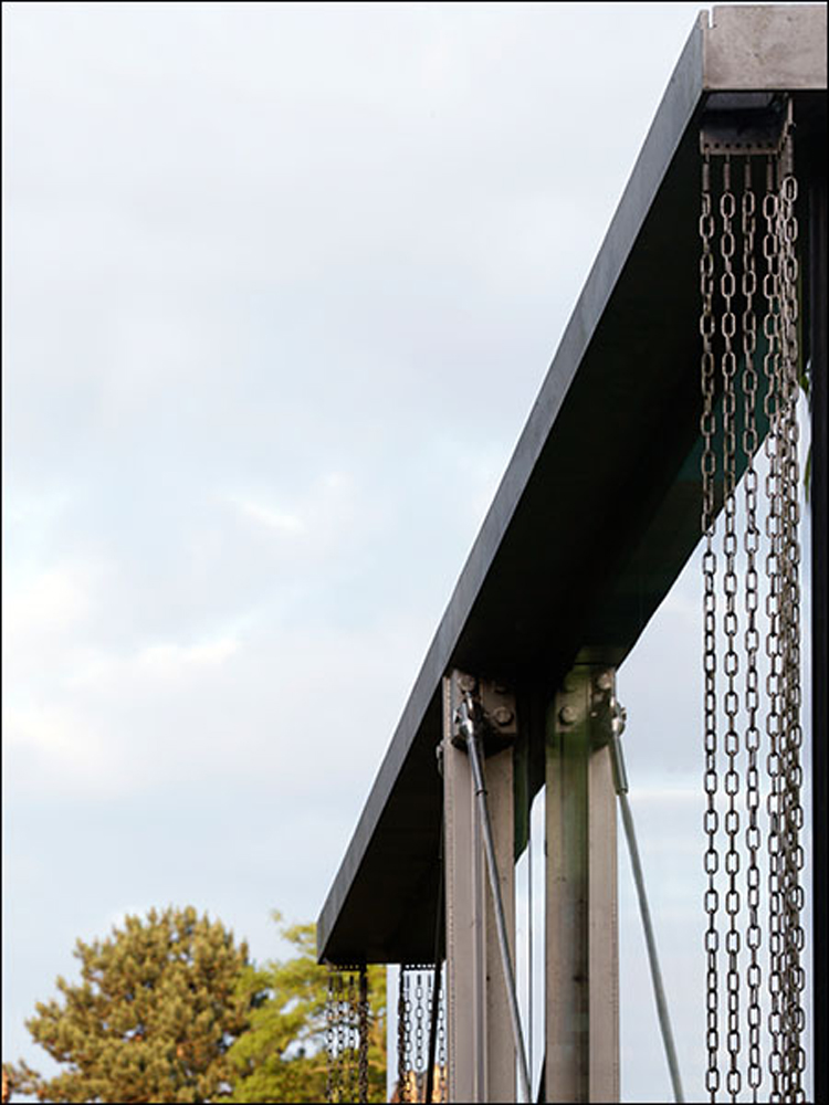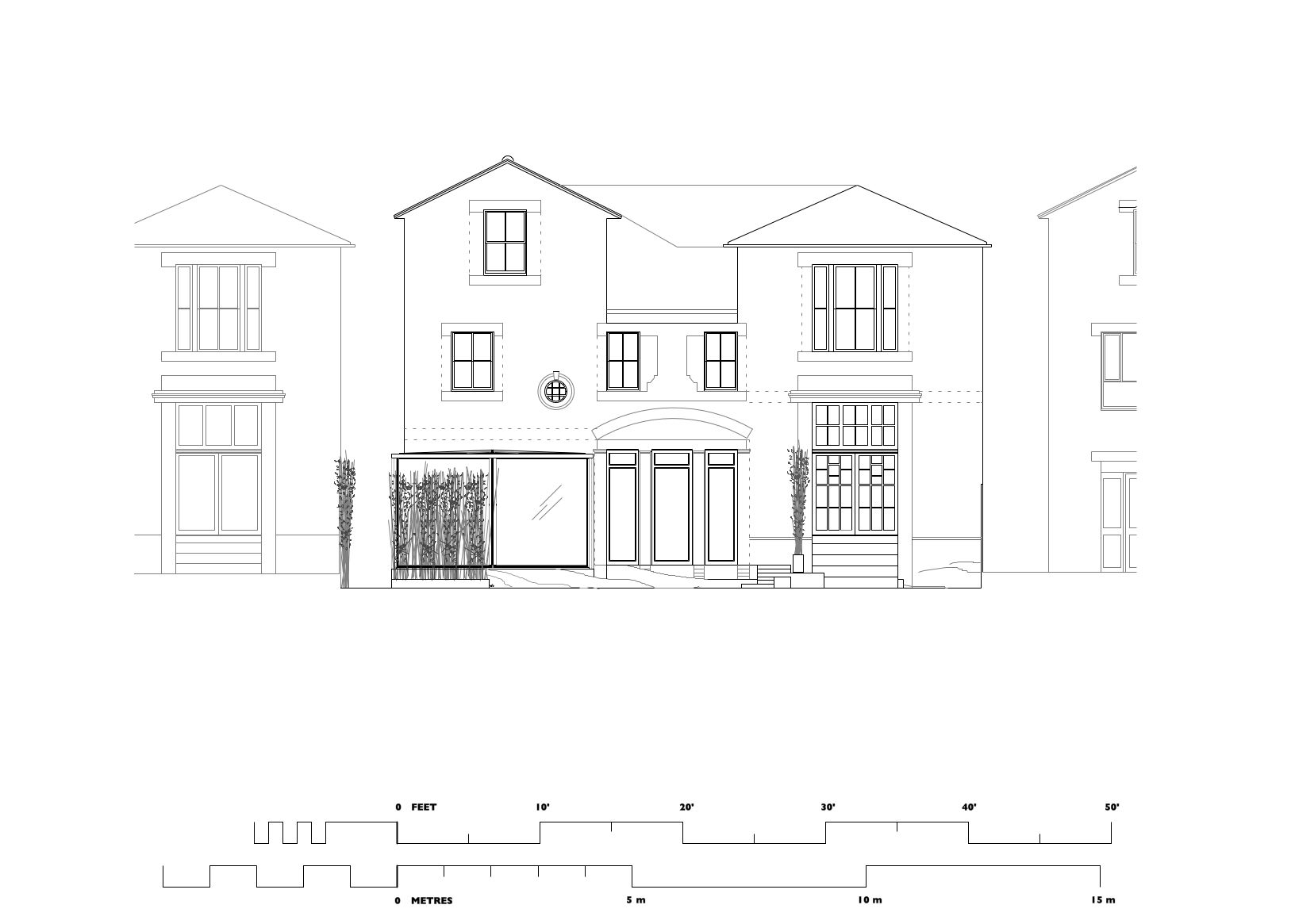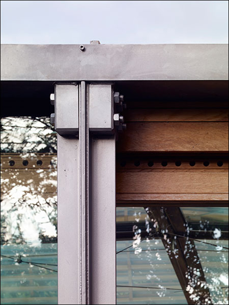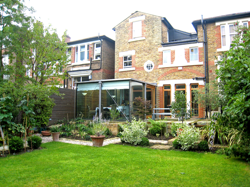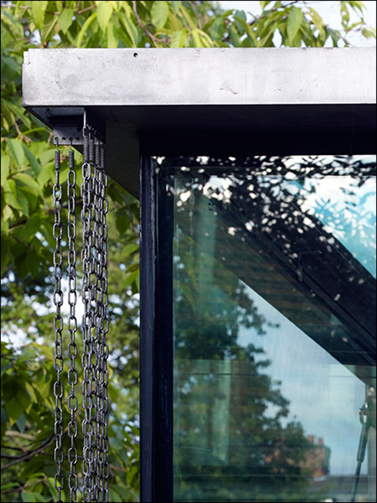 A glass and stainless steel extension to a detached house, whereby the support is formed from stainless steel miesian columns supporting the centre of each perimeter edge allowing the corners each to be cantilevered. So thisfrees the corners for a glass only junction.