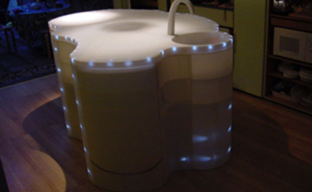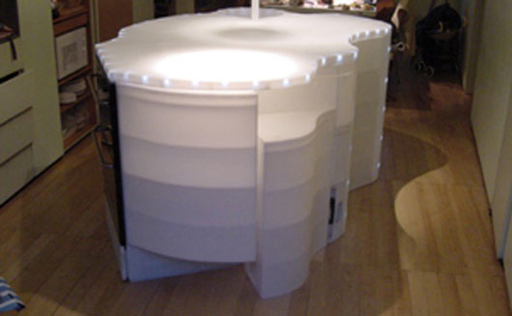 The unit can be dismantled (1 hour) to move to other end of the room. The island unit is made from 3mm and 6mm white polypropylene.