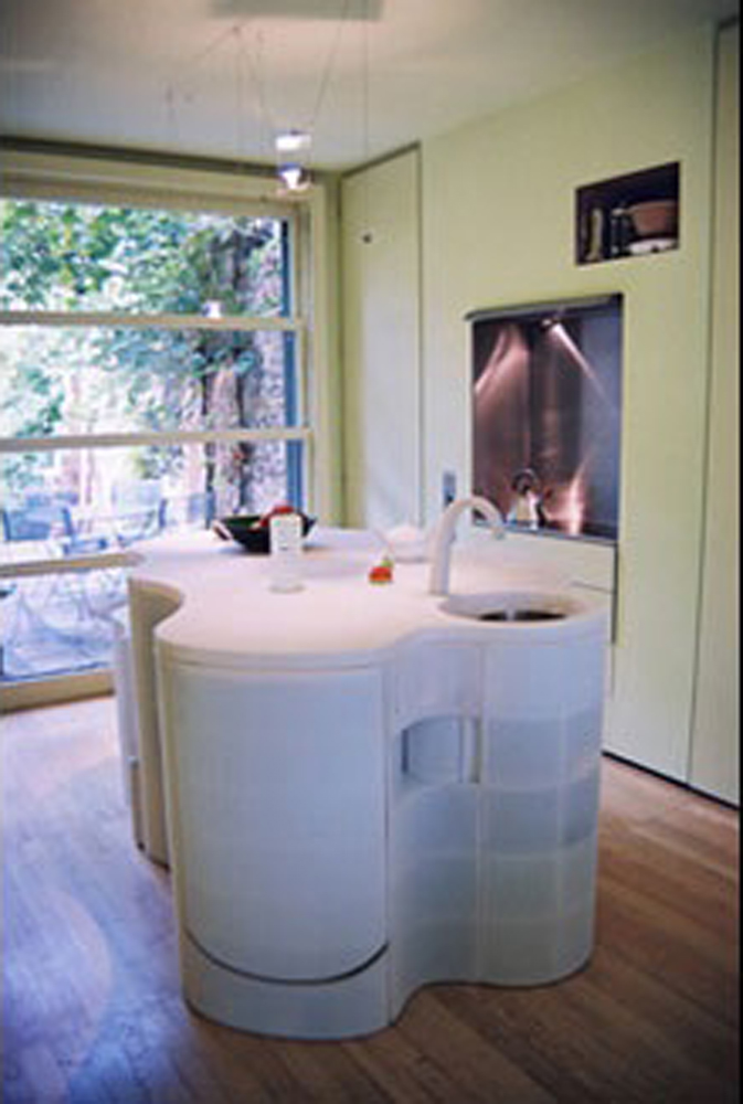 This material is flexible, weld-able, repairable and recyclable. The island unit houses sink, waste disposer, dishwasher, fridge,