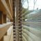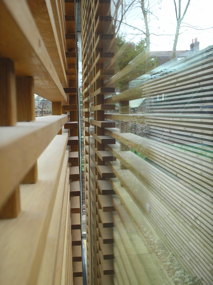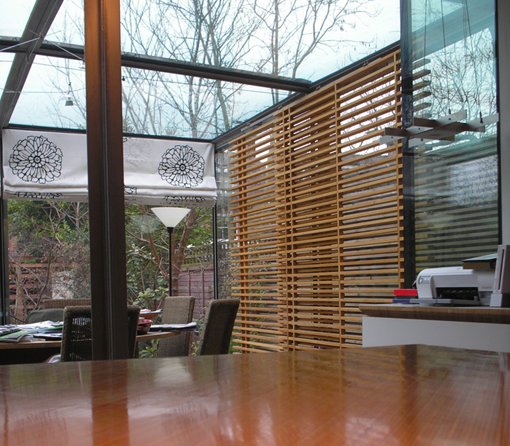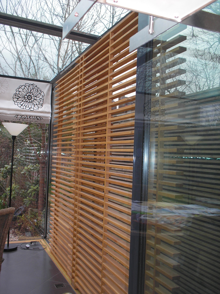Interlocking sliding louvered timber screen panels that can be adjusted to capture daylight