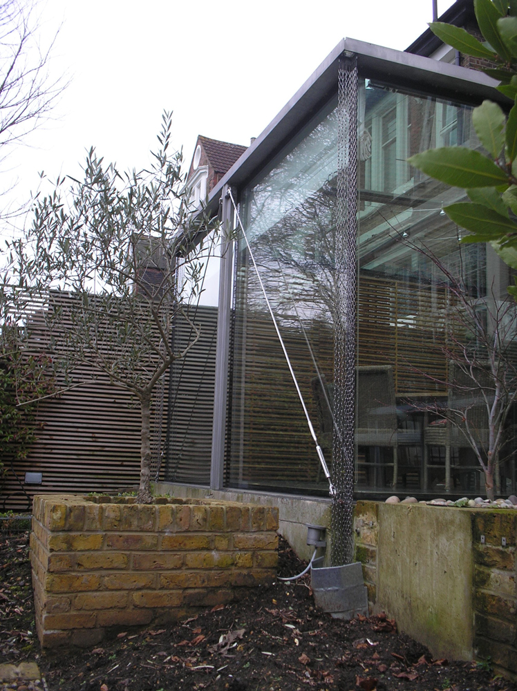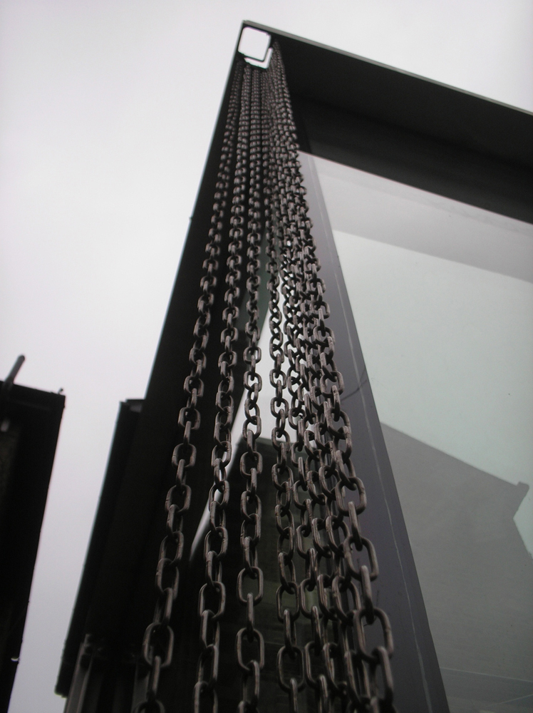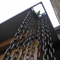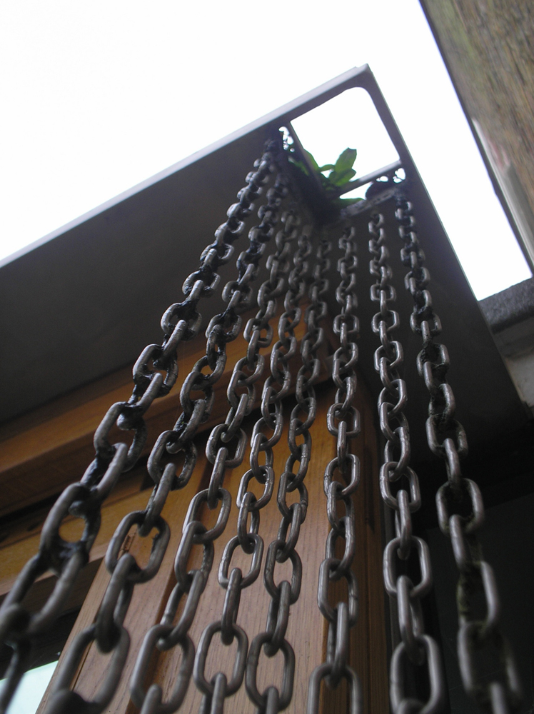 This rain chain made up of multiple copper chains is a beautiful and functional alternative to traditional, closed gutter downspouts. Guiding rain water visibly down the chains from the roof to the ground, it transforms a plain gutter downspout into a pleasing water feature.